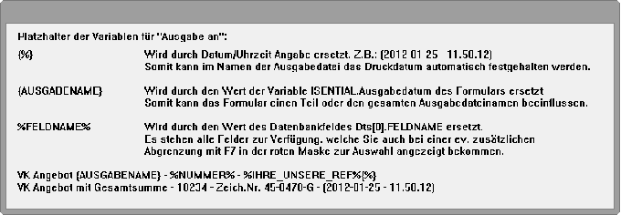 Zusätzlich kann man in dieser Kartei in der Spalte Ausgabe an noch einen Dateinamen angeben, welcher dann bei der Namensvergabe der PDF-Datei Berücksichtigung findet. Bei geschickter Vergabe des Namens kann man später allein aufgrund dieses Namens ein Dokument im Archiv sehr schnell wiederfinden. Mögliche Platzhalter bei dieser Namensvergabe sind: