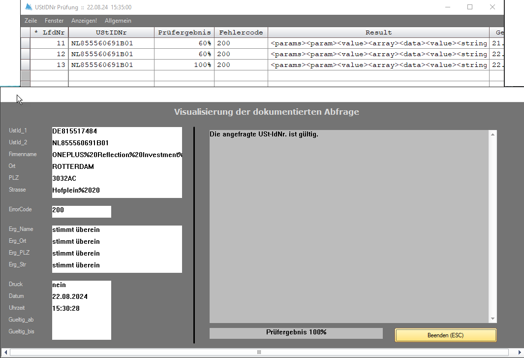 Jede Prüfung einer UStIDNr wird unveränderbar abgespeichert, sobald Sie den Prüfdialog über einen Klick auf die Schaltfläche "Dokumentieren" bzw. die ESC-Taste verlassen. Nachfolgende Prüfungen werden chronologisch abgelegt, so dass ein lückenloser Nachweis der einzelnen Prüfungen dokumentiert ist.