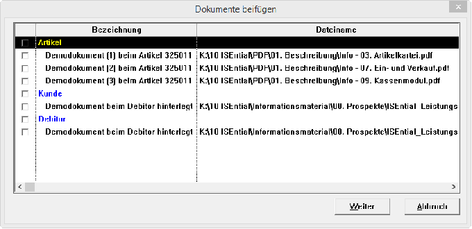 Ähnlich verhält es sich mit der Option „Dokument anfügen“. Allerdings können Sie hier mehr frei im vorhandenen Dateisystem oder Netzwerk Dateien auswählen, sondern es werden Ihnen die im Kontext passenden, dem Kunden/Lieferanten oder Artikel zugeordneten Dokumente zur Auswahl angeboten.