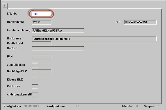 Für alle nicht deutschen Bankverbindungen eines deutschen Debitors oder Kreditors muss ein Eintrag manuell erstellt werden. Vergeben Sie bitte eine eindeutige Lfd.Nr., welche allerdings negativ sein muss. Somit erreichen wir eine einfache Unterscheidung zwischen manuell eingetragenen und den von der Deutschen Bundesbank gelieferten Daten.