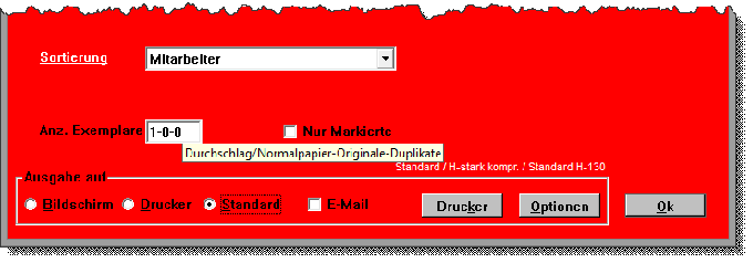 Immer, wenn der PDF-Druck ausgewählt wurde, erscheint im Druckfenster keine einfache Abfrage der Anzahl Ausdrucke mehr, sondern die komplexere Eingabe dieser drei Werte in der Form: „m-n-o“. Hierbei steht „m“ für Durchschlag (i. d. R. Normalpapier), das „n“ steht für „Original“ (i. d. R. Vordruck Geschäftspapier oder Overlaydruck des Geschäftspapiers) und „o“ für „Duplikat“ (i. d. R. wie Original, aber mit Zusatz: Duplikat oder Kopie). Wenn Sie in der Druckmaske mit dem Mauszeiger auf das Feld Anz. Exemplare zeigen, wird Ihnen diese Information auch als kleiner Hilfetext eingeblendet.