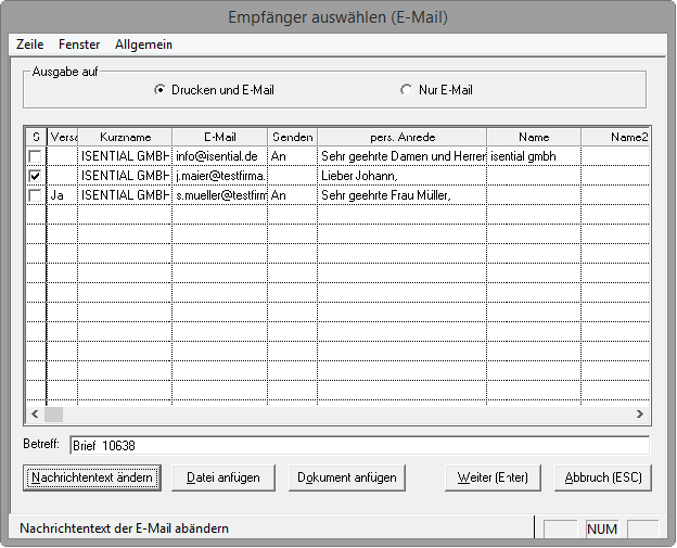 Natürlich können wir auch wie gewohnt mit der Taste F3 zusätzliche Zeilen errichten und weitere Adressen manuell einpflegen. Oder mit der Taste F4 nicht benötigte Zeilen der Übersichtlichkeit halber wieder löschen. Gesendet wird eine E-Mail aber nur an Adressen, welche mit einem Haken auch ausgewählt sind.