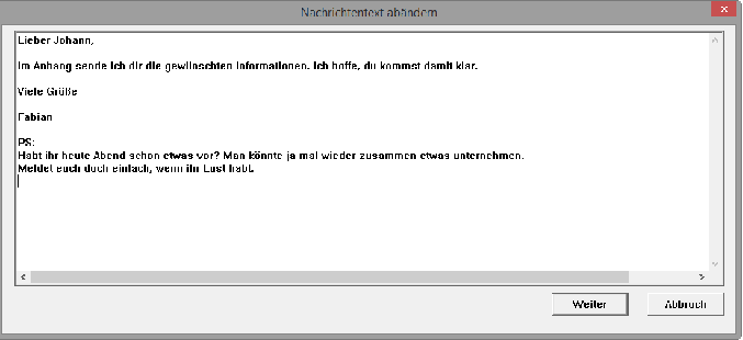 Wie Sie sehen, kann man den gesamten Text ohne Probleme abändern. Sogar kleine, persönliche Mitteilungen sind möglich. Aber Vorsicht! Beachten Sie dabei immer die Compliance-Regeln Ihres Unternehmens. Die verschickte E-Mail wird in dieser Form im Archiv abgelegt werden.