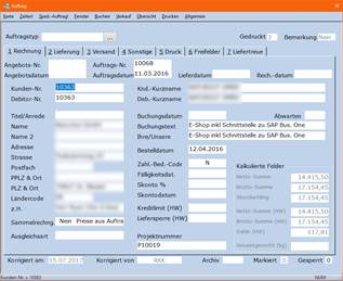 An dieser Stelle sind bereits alle „Kopfdaten“ mit sinnvollen Werten gefüllt. Sie mussten lediglich mit F3 einen neuen Auftrag erreichten, den Kunden durch direkte Eingabe weniger Zeichen auswählen und schließlich auftragsbezogene Angaben machen. Jetzt müssen Sie noch die Zeilen (Positionen) eingeben.