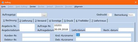 · Wir möchten jedoch einen neuen Auftrag erfassen und nicht einen bestehenden bearbeiten. Dazu errichten wir ihn mit der Funktionstaste F3. Wir erhalten einen leeren Auftrag mit einer automatisch erstellten Auftragsnummer und bereits mit Vorschlägen gefüllten Standardfeldern.