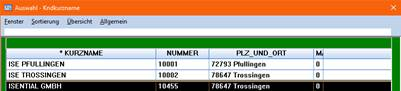 Falls ISEntial mehrere passende Einträge zu Ihrer Eingabe findet, blendet es eine Auswahl mit den in Frage kommenden Kunden ein. Hier können Sie den entsprechenden Eintrag auswählen, indem Sie in die Liste mit der Tabulatortaste gehen, mit den Pfeiltasten auf den richtigen Kunden gehen und diesen mit der Eingabetaste in den Auftrag übertragen.