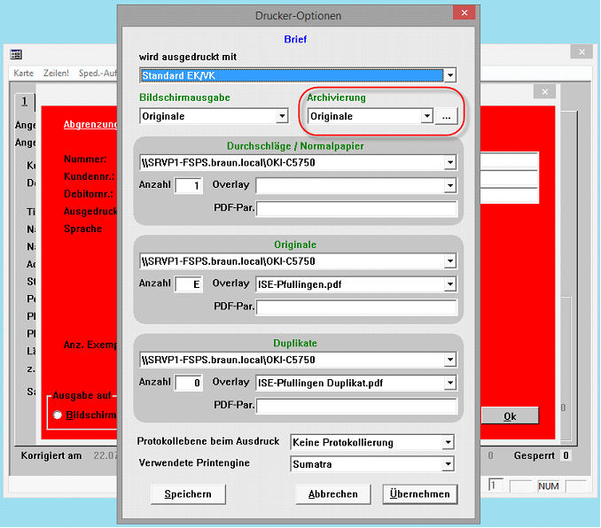Zudem können Sie für diesen Ausdruck über die kleine Schaltfläche „…“ rechts neben dem Archivfeld auch ein anderes Ziel für die Datei angeben, als das standardmäßig vorgegebene Zielverzeichnis für Archivdateien.