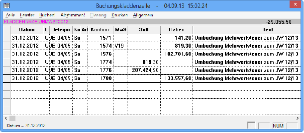 Im Feld Belegnr. eventuell sprechenden Text eingeben (hier: MwSt.-UB 12/13)