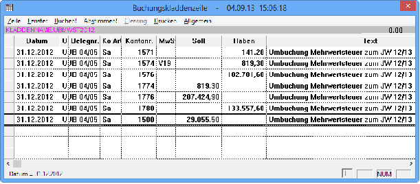 Wenn Sie vergessen diesem Datum ein U voranzustellen, stimmt die Bilanz für den 31.12.2012 nicht und die Kladde kann nicht gebucht werden.