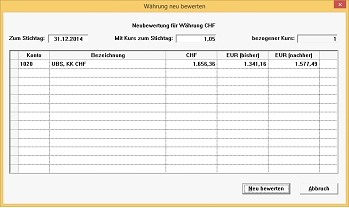 Ein permanentes Nachführen des Nationalwährungsgegenwertes nach jeder Kursschwankung ist nicht vorgesehen. Der Aufwand hierfür stünde in keinem Verhältnis zum Gewinn. Wir haben jedoch eine Funktion eingebaut, mit deren Hilfe Sie Ihre Fremdwährungskonten zu einem bestimmten Stichtag neu bewerten können. Dies geschieht anhand eines an diesem Stichtag gültigen Kurses oder aber absolut durch manuelle Eingabe eines neuen Saldos zum Stichtag. Gewinne oder Verluste bedingt durch diese Neubewertung werden automatisch auf die respektiven Sachkonten Kursgewinne und Kursverluste, hinterlegt beim jeweiligen Währungscode, gebucht.