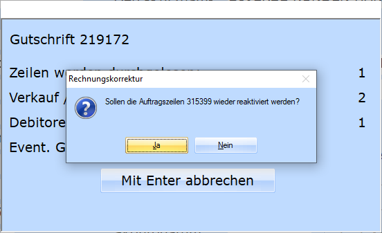 Beantworten Sie die Frage mit 'Ja', werden die Auftragszeilen entsprechend korrigiert, als ob die zu stornierende Rechnung nie gebucht worden wäre. Somit stehen die korrigierten Mengen im Auftrag wieder bereit.