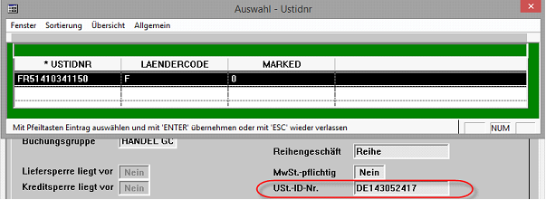 Danach wählen Sie bitte im Feld USt.-ID-Nr. die für das Empfängerland hinterlegte Umsatzsteueridentifikationsnummer aus.